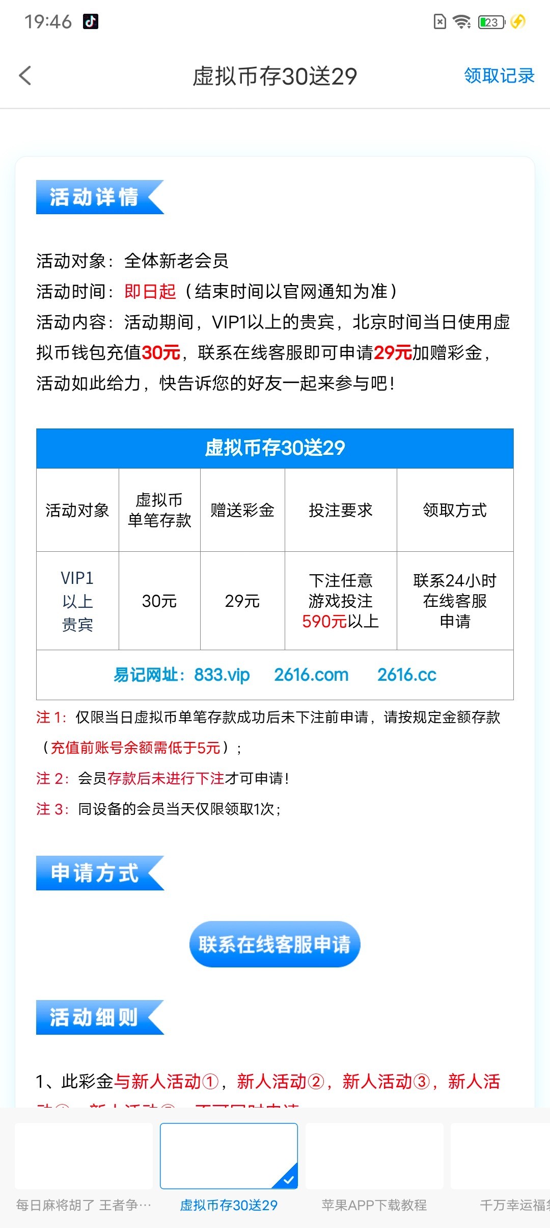 澳门新葡京注册充值20送36,注册当天充值20次日领取36,每天还有虚拟币存30送29,提现秒到账